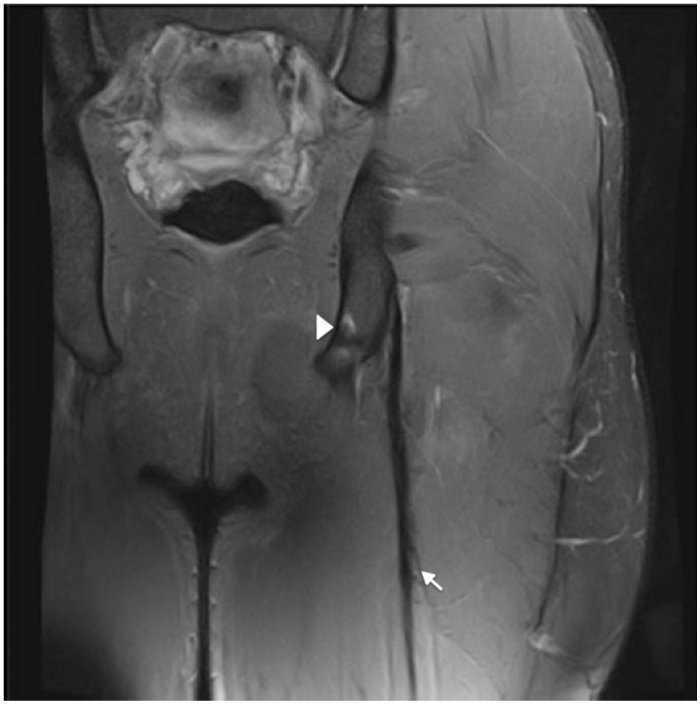 Figura 4 La imagen coronal en T2 con saturación grasa de los isquiotibiales izquierdos durante el seguimiento posquirúrgico muestra el anclaje metálico en la tuberosidad isquiática (punta de flecha) y suturas peritendinosas representadas por artefactos peritendinosos de susceptibilidad magnética (flecha).