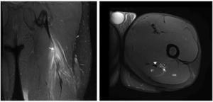Figura 1 Las imágenes coronal y axial en T2 con saturación grasa del isquiotibial izquierdo muestran rotura parcial de fibras en la UMT proximal de PLBF representadas por un área de alta intensidad de señal adyacente a la UMT (flecha). Se observa también rotura de algunas fibras del semitendinoso (+). Vientre muscular semitendinoso (ST), porción proximal del bíceps femoral largo (long head biceps femoris [LHBF]), tendón semimembranoso (punta de flecha) y nervio ciático (*). En el corte coronal se observa edema muscular de patrón en pluma de ave.