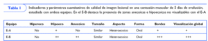 En el caso de la contusión muscular (caso 1), la comparación de las imágenes obtenidas con ambos equipos indica que con el E-B se visualizan zonas anecoicas e hipoecoicas no objetivables con el E-A, por lo que se obtiene una mayor definición de imagen.