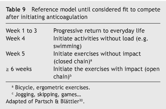 • When beginning activity: (i) protect the individual from direct or indirect injuries that require a level of haemostasis within normal limits; (ii) prevent high intensity isometric exercises of the affected extremity or any that require a considerable increase diaphragm pressure; (iii) determine the degree of activity depending on the recovery process as determined by additional tests (Dimer D, thrombus quality) and the anticoagulation level and associated aspects that characterise normal physical activity. Table 9 shows the standard recommendations in this regard until considered fit to compete31.