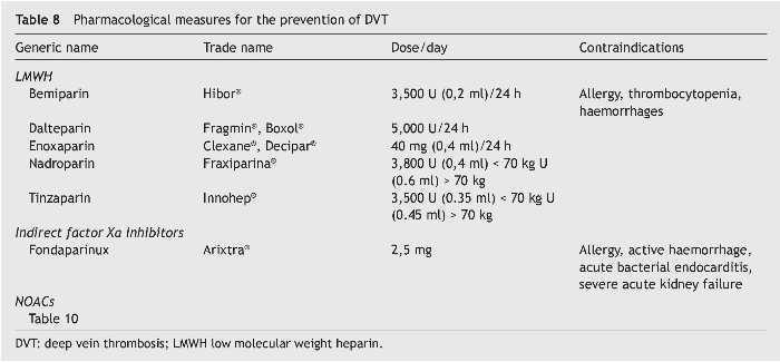 — Without affectation of the saphenous arch (Clexane 40 mg, Fragmin 5,000 IU, Hibor 3,500 IU, Innohep 4500, all every 24 hours with a minimum duration of 7-10 days.