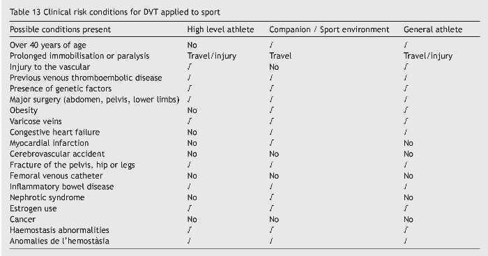 Consideration should also be given to the fact that participating in any sport implies a certain degree of dehydration with the consequent increase of blood viscosity, especially if the athlete cannot, or does not know how to, hydrate themselves well, or there is very abundant fluid loss. It is not unusual for travel to take place soon after the competition. Planes or cars/coaches are vehicles that do not allow for walking for a certain period of time. National flights and bus travels usually last less than two hours, a more than reasonable time to stop and take a rest. Plane trips also have the inconvenience, apart from venous stasis, of being a place where there is a tendency to dehydration due to the low moisture content of the environment41. This aspect should be taken into consideration by athletes during the flight. In regard to height and hydration, it is interesting to note that sports performed at high altitude combine several susceptibility factors, which in themselves have no great influence, but it is not known whether their combination creates an environment favourable to the presence of VTED, hypoxia, dehydration, haemoconcentration, low temperature, tight clothing, reduced mobility, age, previous long trip42. Any suspicious process should alert to an early diagnosis, and any subject with a history should assess their genetic susceptibility (Table 14).