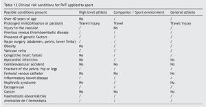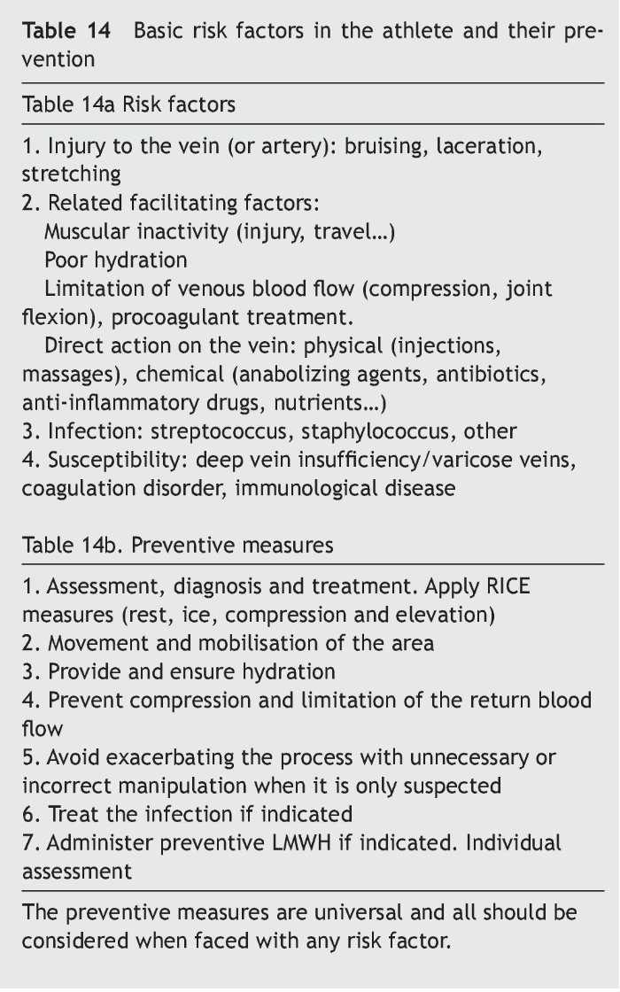 In sport, the intrinsic risk of suffering a VTED is similar to that of non-athletic individuals. However, athletes are in a situation that could result in exposure to unusual or a higher number of risk factors such as injuries, travel, immobilisation, haemoconcentration, and polycythaemia. The presence of a genetic hypercoagulability disorder adds a further risk1 which can then be extraordinarily increased in individuals who fraudulently use certain performance enhancing drugs. On the other hand, thrombophlebitis may be brought about by or expedited by various aetiopathogeneses associated with direct or indirect injury that is accompanied by inflammation of the vessel. The presence of the thrombus may be previous to or a consequence of this inflammation, always aggravating the clinical profile.
