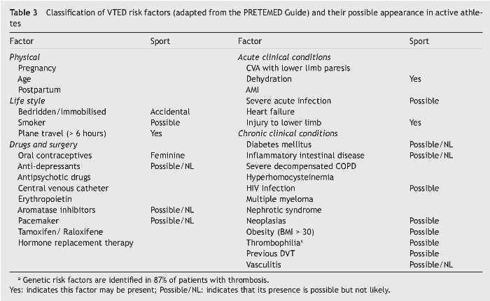There is a classification of risk factors for active athletes that combines those intrinsic to their activity with those related to their quality of physically active individual (Table 3). The genetic risk in patients and family members with a risk of suffering thromboembolic events was studied by considering the factors mentioned in Table 45,12.