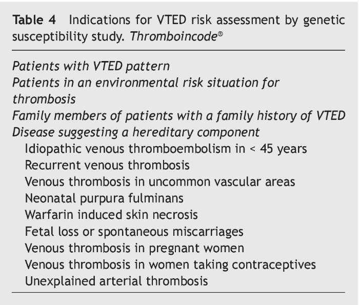 6. Determination of the genetic susceptibility. This determination explains 60% of VTED cases. The presence of any of the indications shown in table 4 justifies its evaluation.