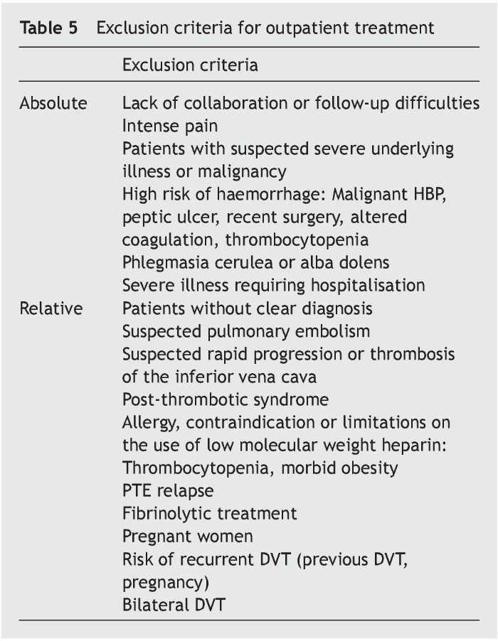 • Active mobilisation of the affected extremity should be initiated as soon as possible. Rest should be relative as of the first day of hospitalisation: although the need has not been demonstrated, it should be adjusted depending on the pain and oedema (adjust days depending on the stage of the thrombus as determined by a specialist in Echo-doppler).