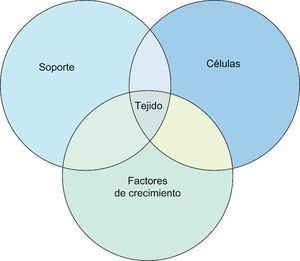 La ingeniería tisular, rama de la bioingeniería, intenta crear o producir tejidos para rellenar defectos tisulares. Para conseguir este fin parte del desarrollo o combinación de uno, dos o de los tres componentes mencionados previamente, así puede crear solo soporte para que sirva de andamiaje a las células del propio individuo o soporte con células para ser implantado en el defecto tisular como por el ejemplo el implante de matriz de colágeno con condrocitos autólogos cultivados (MACI), (Figura 2).