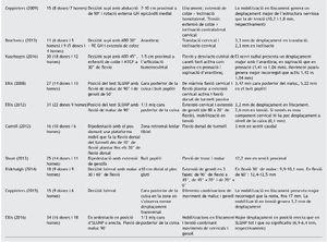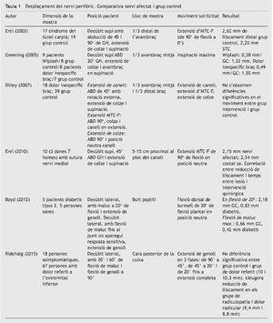 Dels 20 articles seleccionats per revisar, 6 comparen el desplaçament de l’estructura nerviosa en persones amb algun tipus de neuropatia perifèrica o dolor inespecífic, amb el grup control de persones asimptomàtiques40-45 (taula 1). Els 14 restants realitzen el mesurament del desplaçament de l’estructura nerviosa de persones sanes a partir del nervi medial37,46-50, del nervi radial51, del ciàtic i les seves terminaciones52-58 (taula 2).