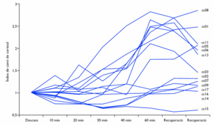 Figura 1 Evolució en els canvis plasmàtics de cortisol durant la prova respecte dels valors en repòs en tots els subjectes participants en l'estudi.