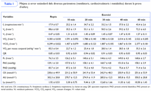 Taula 1 Mitjana ± error estàndard dels diversos paràmetres (ventilatoris, cardiocirculatoris i metabòlics) durant la prova d'esforç