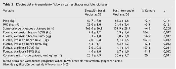 La tabla 1 registra las características sociodemográficas, las características del cáncer y los tipos de tratamiento recibido. Las tablas 2-4 presentan los resultados de las variables morfofuncionales, CV y medición de biomarcadores después del período de entrenamiento de 22 semanas. Después de un período de entrenamiento de 22 semanas, no se observaron disminuciones significativas en el peso, IMC y sumatorio de pliegues cutáneos. El consumo máximo de oxígeno mostró un aumento significativo de 5,1 ml/kg/min. En ambos brazos se produjo un aumento significativo de la fuerza con los 3 tipos de movimiento de la siguiente manera: flexión de codo (sentado) en el brazo sin vaciamiento ganglionar (BSVG) y en el brazo con vaciamiento ganglionar (BCVG), 2,9-3,0 kg, correspondiente a un aumento de la fuerza máxima del 56 y del 104%, respectivamente. En ejercicios de press de banca, en el BSVG y el BCVG se registró un incremento de 1,8 y de 2,1 kg, que representa un aumento de la fuerza máxima de un 42 y un 101%, respectivamente. En ejercicio de mariposa se registró un aumento de 1, 6 kg en el BSVG y de 2,1 kg en el BCVG, lo que representa un aumento de la fuerza máxima de un 41 y un 103%.