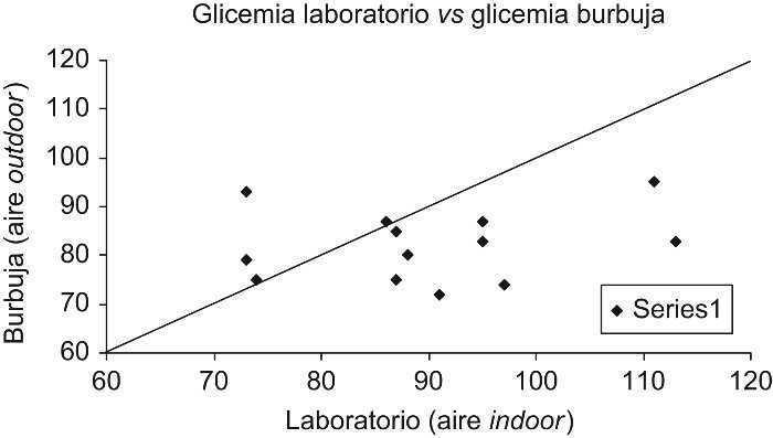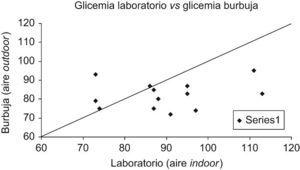 Idéntico comportamiento observamos en los niveles de glucosa en sangre capilar, que mostraron un incremento del 112% en la situación habitual (indoor) en comparación con los de la burbuja de aire purificado y exterior (glicemia: 90,0±12,2mg/dl vs 82,15±6,94mg/dl; p>0,054 no significativo; n=13).