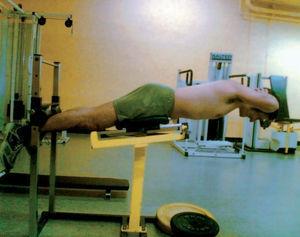 A los jugadores del grupo 2 se efectúa la historia de su patología lumbar. A cada individuo se le practican 3 test clínicos específicos. En primer lugar el test de Adams: en bipedestación y sin flexionar las rodillas, se realiza una flexión del tronco con los brazos extendidos, para descartar rotaciones del tronco secundarias a escoliosis. En segundo lugar se mide la longitud de las extremidades inferiores, para descartar disimetrías. Y en último lugar se mide el ángulo poplíteo de cada rodilla: en decúbito supino con la cadera a 90° de flexión en rotación neutra, y se mide el ángulo complementario a la máxima extensión pasiva de la rodilla. A continuación, antes de la realización del test TSB, los individuos realizan ejercicios de calentamiento, sin carga, de la musculatura lumbar (5 repeticiones) para reducir el riesgo de lesiones. El TSB explora la resistencia isométrica de los músculos extensores del tronco (musculatura lumbar). El paciente se coloca en decúbito prono sobre un banco de trabajo lumbar, con la pelvis y los tobillos fijados y el tronco libre a partir de las espinas ilíacas anterosuperiores. Con las manos en la nuca, el sujeto ha de mantener la horizontalidad del cuerpo efectuando una contracción isométrica de la musculatura lumbar el mayor tiempo posible (cronometrado). Los individuos se instruyen para mantener la posición tanto como les sea posible, y durante el test reciben un estímulo si la posición se sitúa por debajo del nivel horizontal. La posición horizontal se controla por una plomada colgante que se coloca rozando su espalda, lo que permite al individuo darse cuenta de si mantiene la horizontalidad (fig. 1).