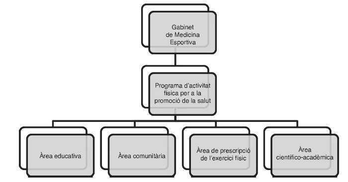 Tal com s’indica a la figura 2, el model actua sobre quatre àrees d’intervenció: educativa, comunitària, prescripció d’exercici físic i científico-acadèmica.