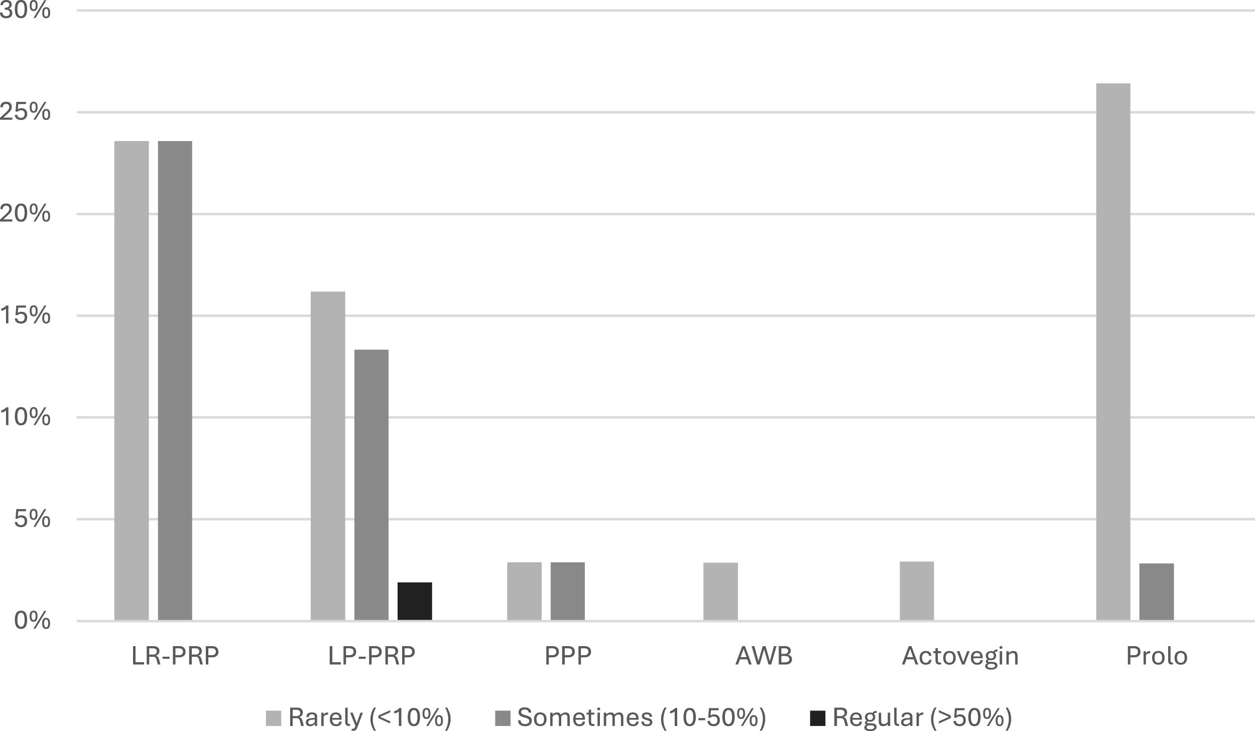 No differences in use of platelet-poor plasma, autologous whole blood, actovegin or prolotherapy were observed in this setting.