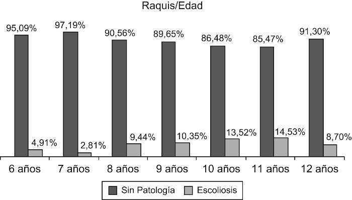 Se puede comprobar en la tabla 1 y en la figura 2 que se clasificó a algo menos de una décima parte de los escolares analizados como escolióticos (el concepto de escoliosis no solo es la desviación lateral del raquis, debe incluir la torsión de las vértebras en el eje axial de este; cuando se trata de una desviación solo en el plano frontal, se trata de una actitud escoliótica), aumentando claramente los índices de escoliosis a medida que se incrementaba la edad cronológica (tabla 1, figura 2).