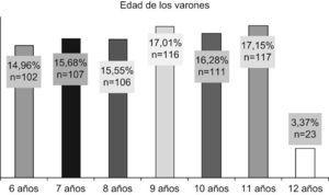 ResultadosLos 682 varones objeto de estudio quedaron distribuidos como se refleja en la figura 1; apreciándose homogeneidad en todos los grupos de edad, exceptuando al grupo de 12 años, que solamente vino representado por 23 sujetos debido a que en esta edad los individuos deberían encontrarse en un ciclo educativo superior (repetidores de curso, matriculación más tardía, etc.) (figura 1).