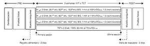Después del pre-test los participantes fueron asignados aleatoriamente a uno de los cuatro grupos y completaron un programa de HIIT progresivo o un programa de TET de tres sesiones por semana. Estos protocolos fueron modificados a partir de investigaciones anteriores utilizando intensidades de entrenamiento y duraciones similares7,15. Dos días después de la finalización de la última sesión de entrenamiento los participantes repitieron la misma batería de pruebas en el mismo orden y bajo condiciones similares a los pre-test. Los registros alimentarios se recogieron dos días antes del pre-test y la misma dieta se repitió antes del post-test, para minimizar la influencia de la dieta en el rendimiento.