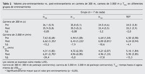 Tabla 2. Valores pre-entrenamiento vs. post-entrenamiento en carrera de 300 m, carrera de 3.000 m y Tmax en diferentes grupos de entrenamiento