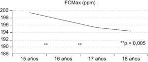 El valor medio de FCM para la edad de 15 años fue de 199,33±5,6; para los 16 años 196,78±5,9; 194,22±5,2 para los 17 y 192,83±7,6 para los 18 (figura 2).