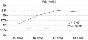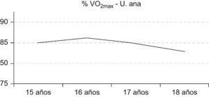 Al no haber encontrado en la literatura científica experiencias que analicen la evolución de este parámetro con la edad, no podemos ni reforzar ni refutar nuestros datos que como el análisis estadístico nos indica, abogan por un mantenimiento en este parámetro de los 15–18 años; sería por tanto interesante seguir profundizando en el estudio de nuevos y variados métodos de valoración de la máxima capacidad aeróbica38 y de los parámetros ligados a la misma para esclarecer el panorama en torno a esta.
