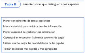 Se requieren altos niveles de entrenamiento para alcanzar el grado de experto. Se calcula que un período cercano a los 10 años de práctica de calidad, basándose en la regla de los 10 años de Simon y Chase3 y el poder de la práctica según Newell y Rosenbloom4. Los jugadores expertos son aquellos que organizan la información de una forma más precisa y eficaz. No disponen de una memoria superior, pero la gestionan mejor porque utilizan recursos aprendidos con eficacia. En ese sentido, el jugador experto tiene unas características muy bien determinadas (tabla II).