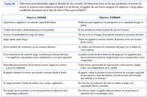 La opción no es tan bien definida en ningún caso. Los términos intermedios existen, pero no es menos cierto que los ejemplos en uno y otro modelo son claros. Éste es un debate que afecta no sólo a los profesionales que se dedican a la organización, a la gestión, a la investigación, a la enseñanza y al entrenamiento de la mayoría de los deportes, sino también a muchos padres que ven en la actividad deportiva de sus hijos una plataforma de promoción social y económica. La realidad es diferente. En la tabla III se muestran, según Horst Wein10, algunos planteamientos de una escuela deportiva, según el deseo de ganar o formar jugadores y aplicable a cualquier deporte.