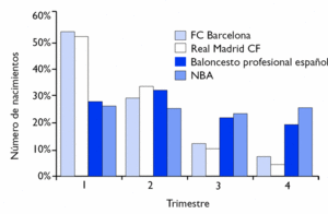 Existe una relación muy significativa entre la fecha de nacimiento y el éxito deportivo observada desde hace un tiempo, determinada por la iniciación de la temporada deportiva o del período escolar, por la cultura deportiva del país, etc. Por esa razón, la fecha de nacimiento se ha considerado como uno de los diversos factores en la selección de los talentos deportivos para diversos deportes. Un aspecto interesante, relacionado con la fecha de nacimiento y el rendimiento deportivo, es el de la edad relativa (RAE, relative age effect). El RAE determina la diferencia de edad entre individuos de un mismo grupo de edad. Se ha identificado como un factor que puede tener cierta influencia sobre aspectos muy diversos de carácter sociológico y psicológico o relacionado con el rendimiento deportivo y la actividad física. Así, según diversos autores, este efecto parece influir de manera muy decisiva en la selección del talento deportivo y en su proyección hacia un nivel profesional. Una supuesta selección del deportista por nacer en una determinada época del año quizá subestimaría a futuros talentos cuyo estado de maduración y desarrollo son inicialmente inferiores. En la figura 3 se presenta el efecto de la edad en la selección en baloncesto en dos equipos de nuestro país frente al global de la liga profesional (ACB-LEB 1 y 2) y la NBA. Se observa un efecto relativo de la edad en los jugadores de baloncesto de nivel profesional español y de mayor intensidad en los jugadores pertenecientes al deporte base. No existe este efecto relativo de la edad en el baloncesto profesional americano. Por otro lado12, y respecto a este tema, el nivel de rendimiento de un individuo es el resultado de sus capacidades y de su motivación. El grado de su motivación tiene un impacto importante sobre la calidad de su aprendizaje y su rendimiento. Un jugador nacido al principio del año obtendrá, como media, mejor rendimiento que otro jugador nacido al final del año, además de jugar menos y ser menos veces convocado15. Por eso, esta situación deben evaluarla los técnicos, los científicos y los políticos del deporte para establecer las herramientas y los sistemas adecuados de selección, de seguimiento y de entrenamiento de los deportistas con el objeto de optimizar los jugadores que podamos disponer en el futuro.