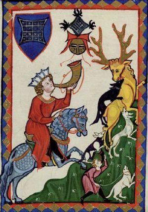 Figura 3 Miniatura que representa al poeta Herr Geltar. En la obra de este autor hay una crítica a la concupiscencia de las costumbres aristocráticas. Posiblemente, el hecho que el animal que se escape sea el que sube por la ladera signifique que aquel que mira el Cielo, es decir, a Dios, se salva. Procedente del Codex Manesse, 1305-1340 (Heidelberg Universitätsbibliothek, Codex Palatinus Germanicus 848, fol. 320v).