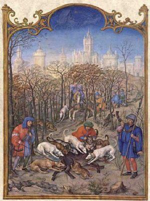 De todos modos, antes hay que explicar que la caza se dividía en dos modalidades. La primera es la chasse à courre, en que se cazan animales en el bosque, desde ciervos hasta liebres. Para ella son imprescindibles los perros, y consiste en espantar la presa provocando un gran tumulto, seguirle el rastro mientras huye, acercársele y arrojar a los perros contra ella. Cuando el animal se agota o llega a un punto en que el camino se cierra, reacciona dándose la vuelta y enfrentándose a sus perseguidores: es entonces cuando los perros se le lanzan encima y el cazador ayuda a completar la tarea.