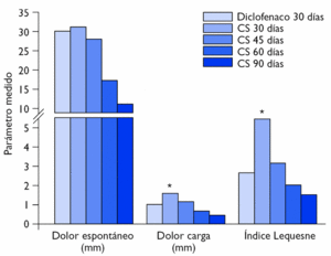 Teniendo en cuenta únicamente las medidas de dolor y funcionales a los 30 días de tratamiento, puede concluirse que el CS disminuye el dolor espontáneo con la misma eficacia que el DS. Sin embargo, a los 30 días de tratamiento, el efecto del CS sobre el dolor a la carga y sobre el índice Lequesne es inferior al alcanzado con DS.