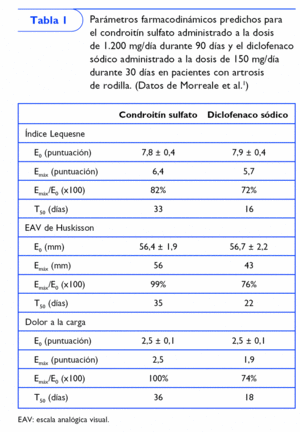 Los resultados de este estudio (tabla I) sugieren que la respuesta más favorable predicha en pacientes con artrosis de rodilla que han recibido 800 mg/día de CS durante 90 días es ligeramente superior a la predicha para el DS, aunque el CS tarda el doble en conseguir el efecto más favorable. No obstante, el efecto remanente del CS persiste el doble que el del DS.