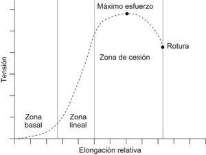 Figura 1. Gráfica típica de tensión/elongación relativa de cualquier material viscoelástico con las zonas típicas: basal, lineal y de cesión. A diferencia del modelo de gráfica que muestran los materiales elásticos (muelle ideal), tan sólo la zona lineal conserva la relación de proporcionalidad entre tensión y deformación.