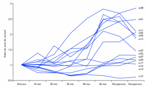 En nuestro estudio obtuvimos importantes diferencias interindividuales, probablemente con consecuencias en la respuesta al entrenamiento o en la adaptación a diferentes situaciones de estrés, a pesar de tener un grupo muy homogéneo en cuanto a comidas previas a la prueba, horas de sueño y la realización del test a la misma hora.