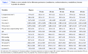 Tabla 1. Medias ± error estándar de los diferentes parámetros (ventilatorios, cardiocirculatorios y metabólicos) durante la prueba de esfuerzo