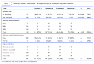La distribución de la fecha de nacimiento por trimestres de los grupos de referencia, el baloncesto base y baloncesto profesional español se muestran en la tabla 1, comparados con los grupos de los jugadores de la NBA y el grupo de deportistas de deportes individuales. Los datos que utilizamos se estandarizan porcentualmente para una más cómoda manipulación e interpretación. En la columna RAE se observa la proporción en número de nacimientos que existe entre la primera mitad y la segunda del año.