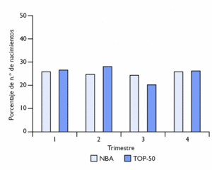 A continuación analizamos si esta tendencia observada en el baloncesto español se da de forma similar en la NBA, la competición que todo el mundo toma como modelo. Los resultados observados son diferentes a los observados en el ámbito español. No hay diferencias significativas en cuanto al porcentaje de nacimientos entre los 4 trimestres del año (r = 0,07, valor del test = 0,39). Aprovechando la reciente selección de los 50 mejores jugadores de la NBA de todos los tiempos, se evalúan los mismos datos y se observa que los resultados son similares a los actuales de toda la NBA. No hay diferencias significativas entre un trimestre y otro (r = 0,30, valor del test = 0,72; fig. 2).