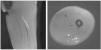 Eighteen years old professional football player suffered the same kind of pain in the same kind of circumstances. Clinical signs were exactly similar than the previous acute hamstring strain described but the MRI exam showed different images (Figs. 3 and 4) because the injury was located in the free tendon of BF. The length of free-tendon was 8.5 cm and the injury was located at 6.5 cm from the ischial tuberosity. Due to the long time of recovery and a high reinjury rate, surgical treatment should be considered. Excision of the scar tissue, including the torn portion of the tendon was then performed and tension-free suturing of the belly remnant of the biceps femoris to the adjacent semitendinosus. In order to provide tension to the tendon and reinforcement with anchors in ischial tuberosity (Figs. 3 and 4).